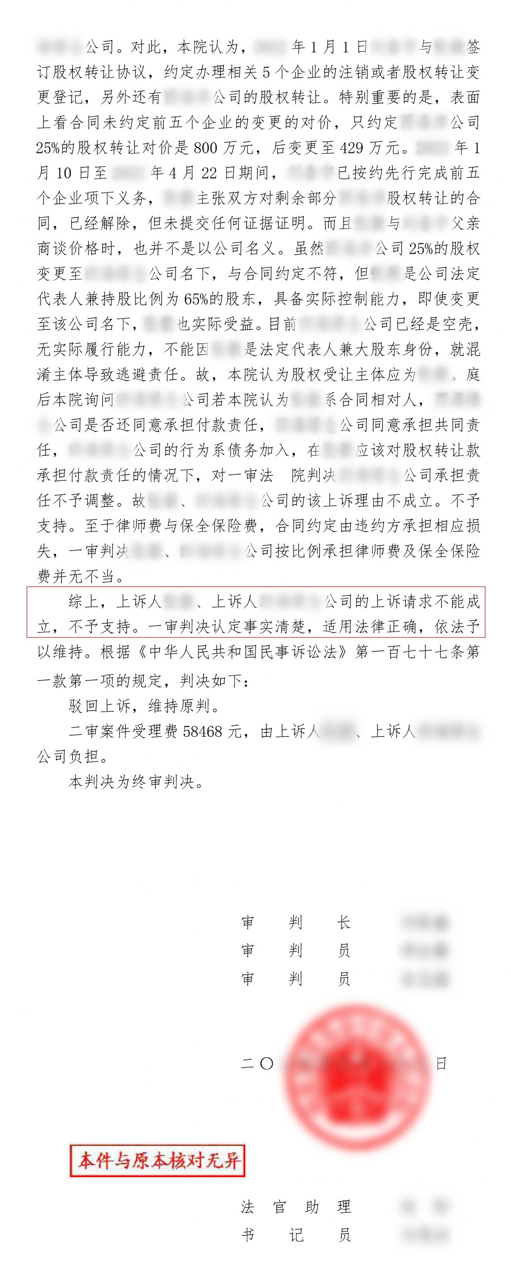 2、向原告支付款项的几家公司均由被告实际控制,从付款主体混同、股权登记操作等事实可以看出,被告一系实际权利义务人。若仅依据协议形式外观认定被告二为受让方,无疑将纵容被告一通过关联公司转移资产、逃避债务。